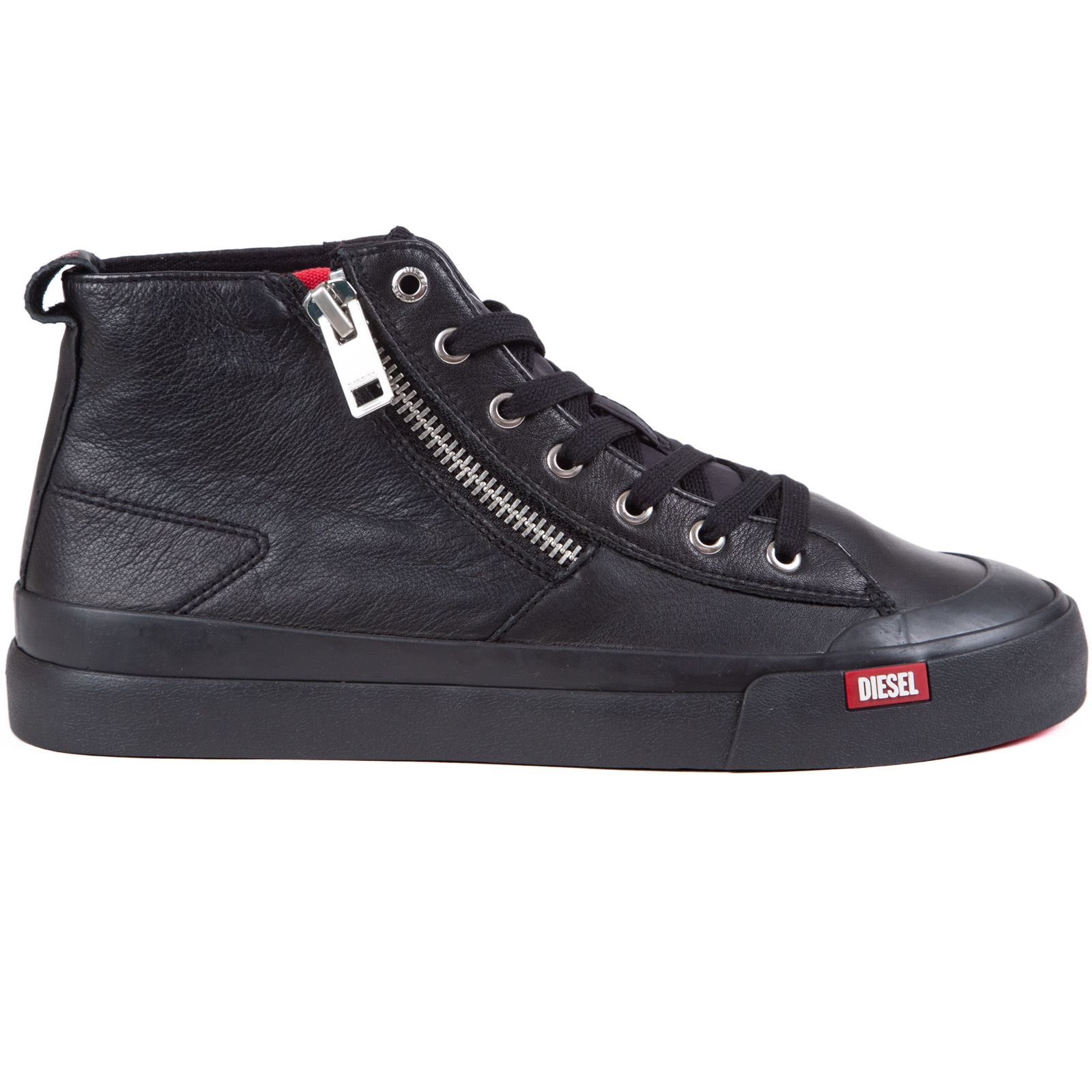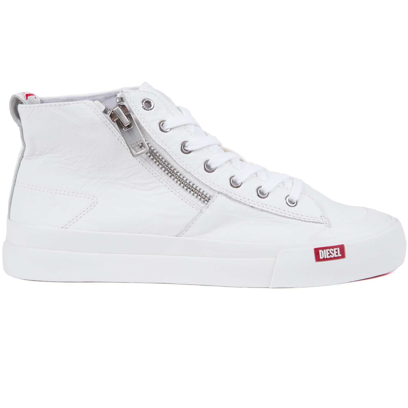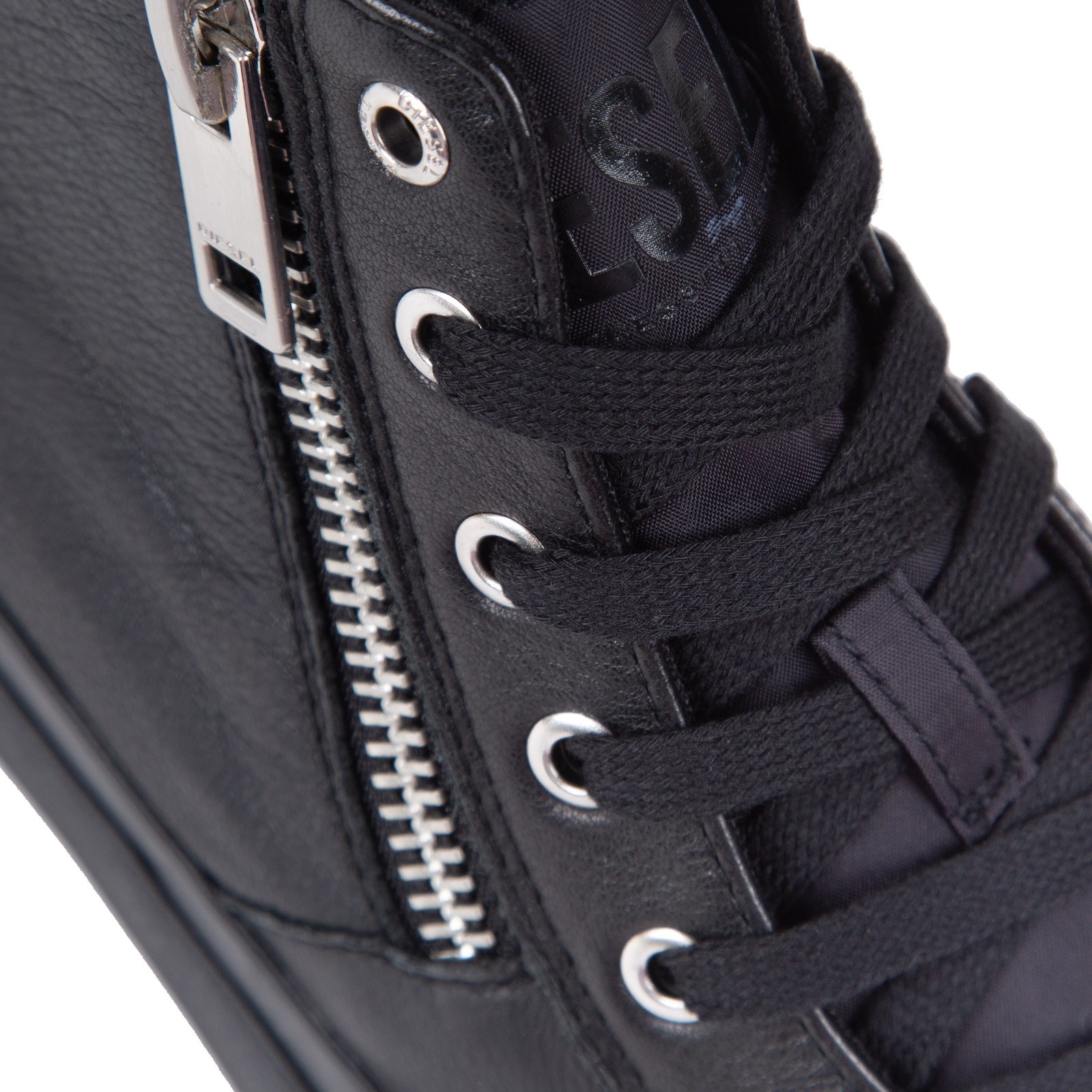 Timeless and versatile, these classic leather hi-top sneakers are a classic. Styled with an inner side zip and logo print, the upper is reinforced with high foxing and a rubber sole. Wear them with jeans and a hoody.