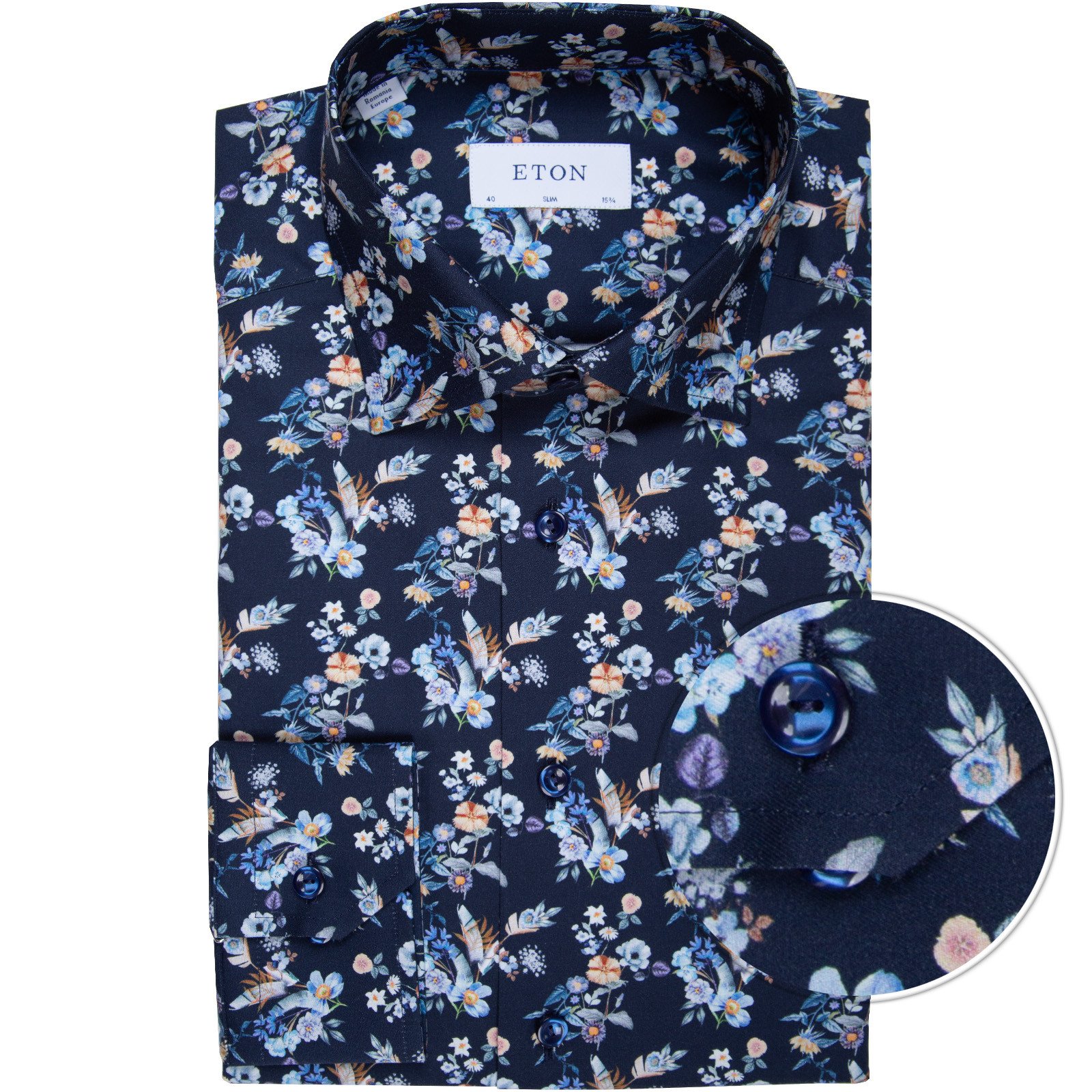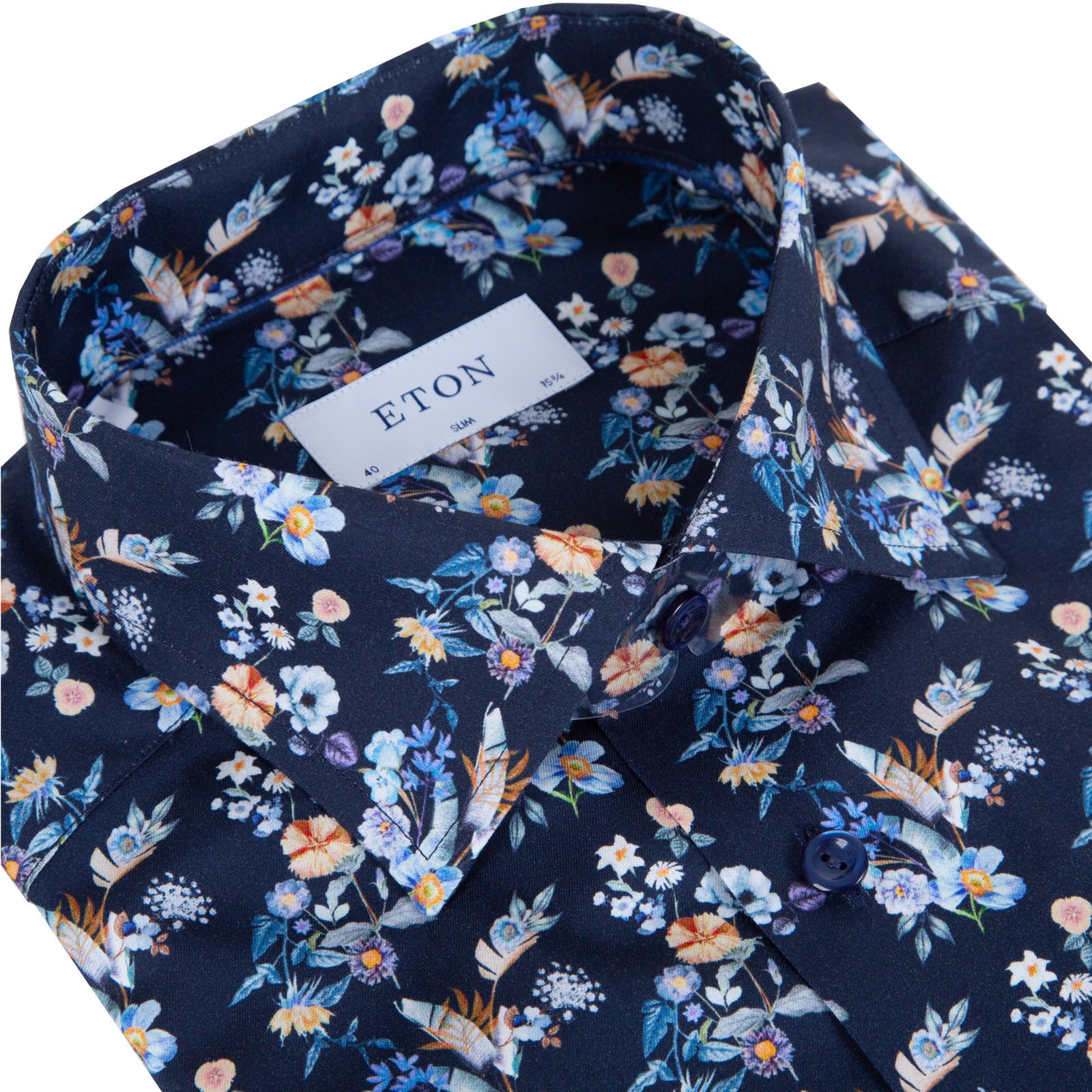 Slim fit dress shirt in a luxury cotton with a floral print. Features darts in the back for a slim tapered fit. Double button cuffs with extra button hole for cufflinks. Spread collar with fixed bones.