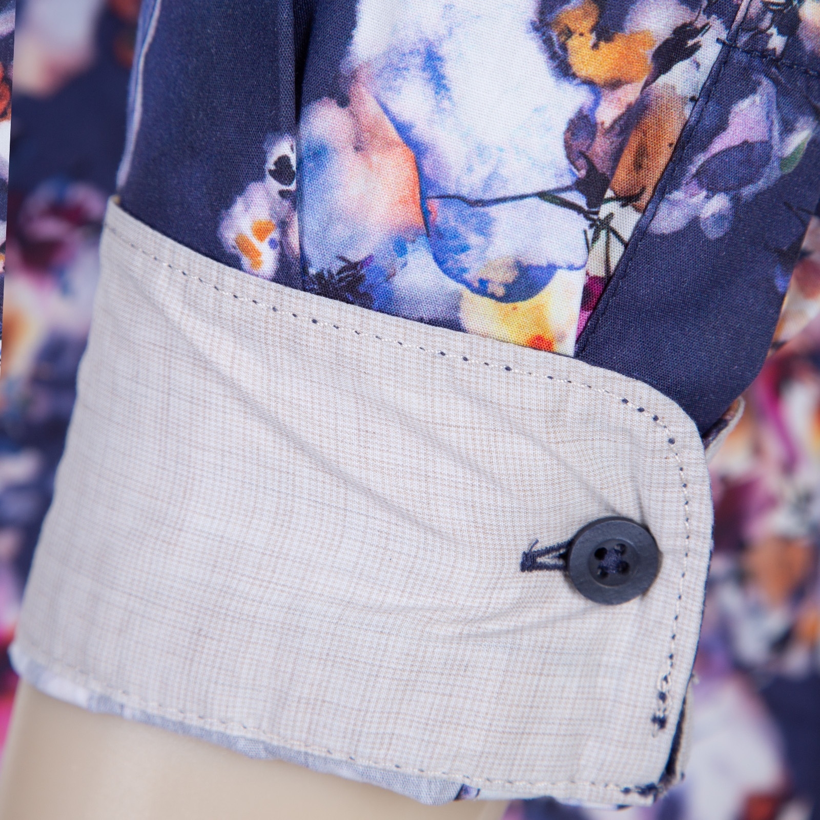 A tapered fit casual shirt in a soft cotton with a floral print and subtle trim detail. Features darts in the back for a tapered fit, and soft fashion under-button down collar.
