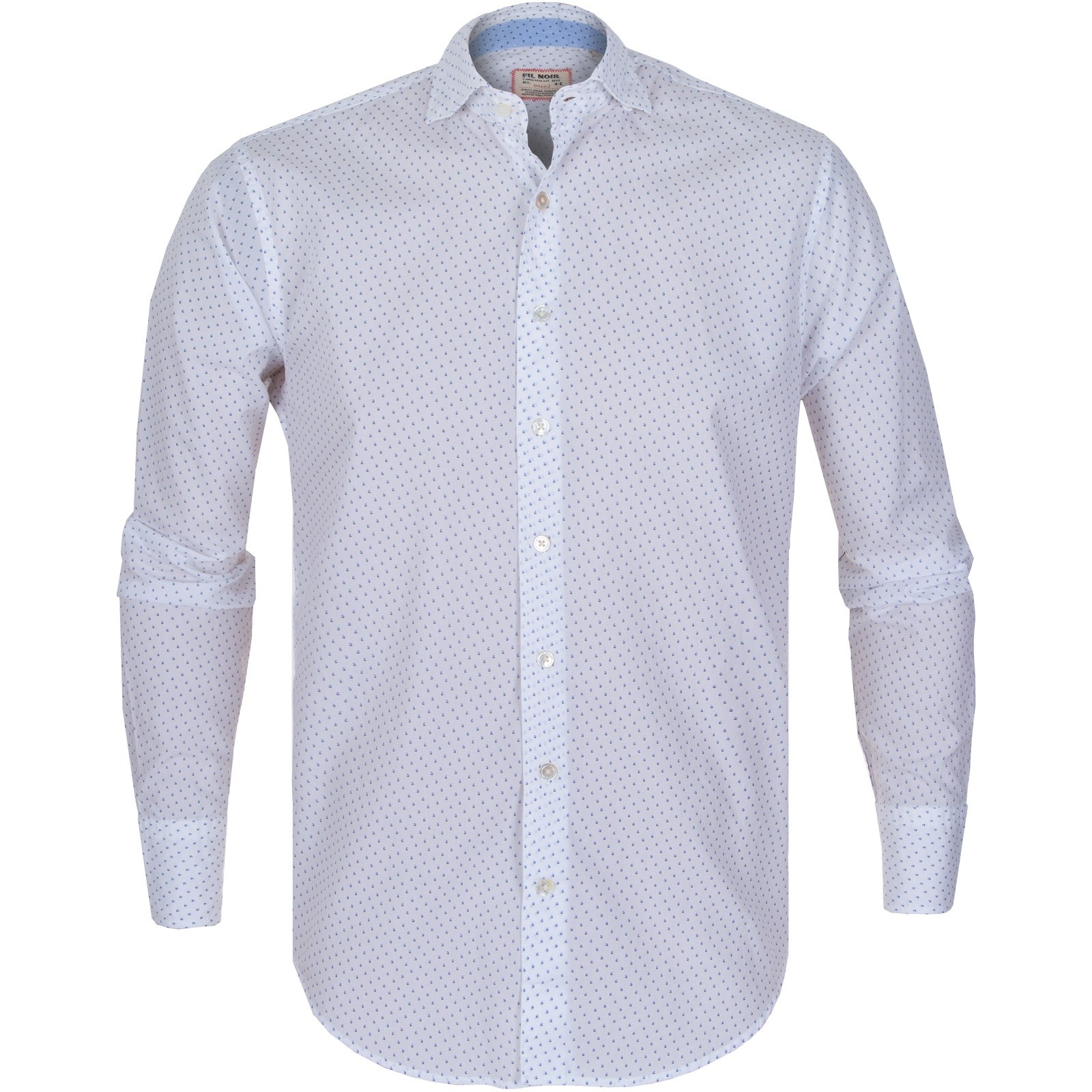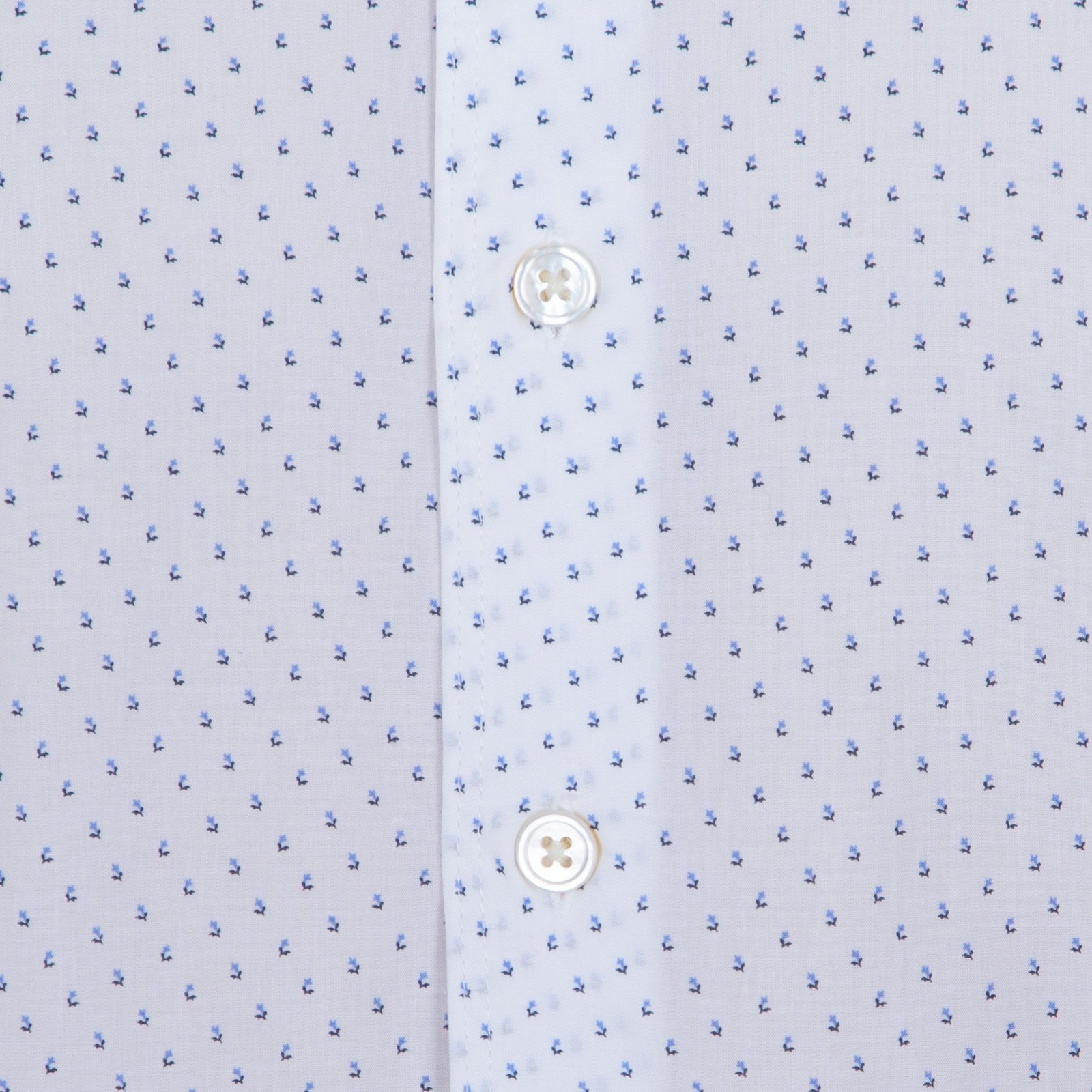 A tapered fit casual shirt in a soft cotton in a fine geometric pattern, with subtle trim detail. Features darts in the back for a tapered fit, and soft fashion under-button down collar.