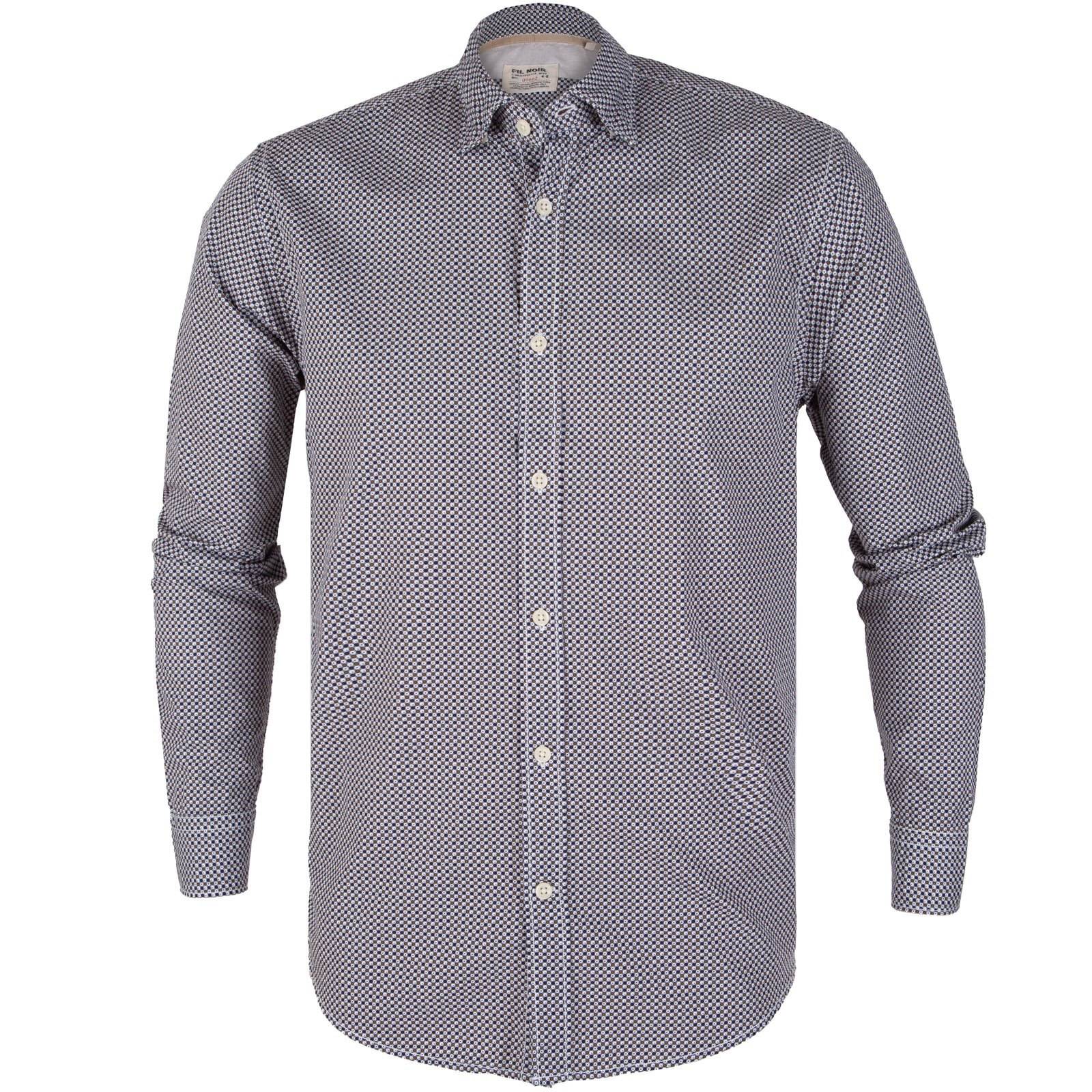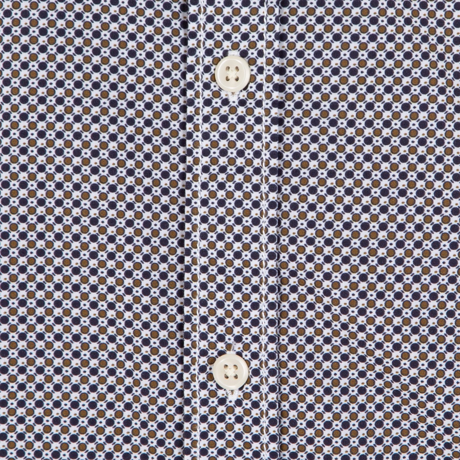 A tapered fit casual shirt in a soft cotton with a micro geometric print and subtle trim detail. Features darts in the back for a tapered fit, and soft fashion under-button down collar.