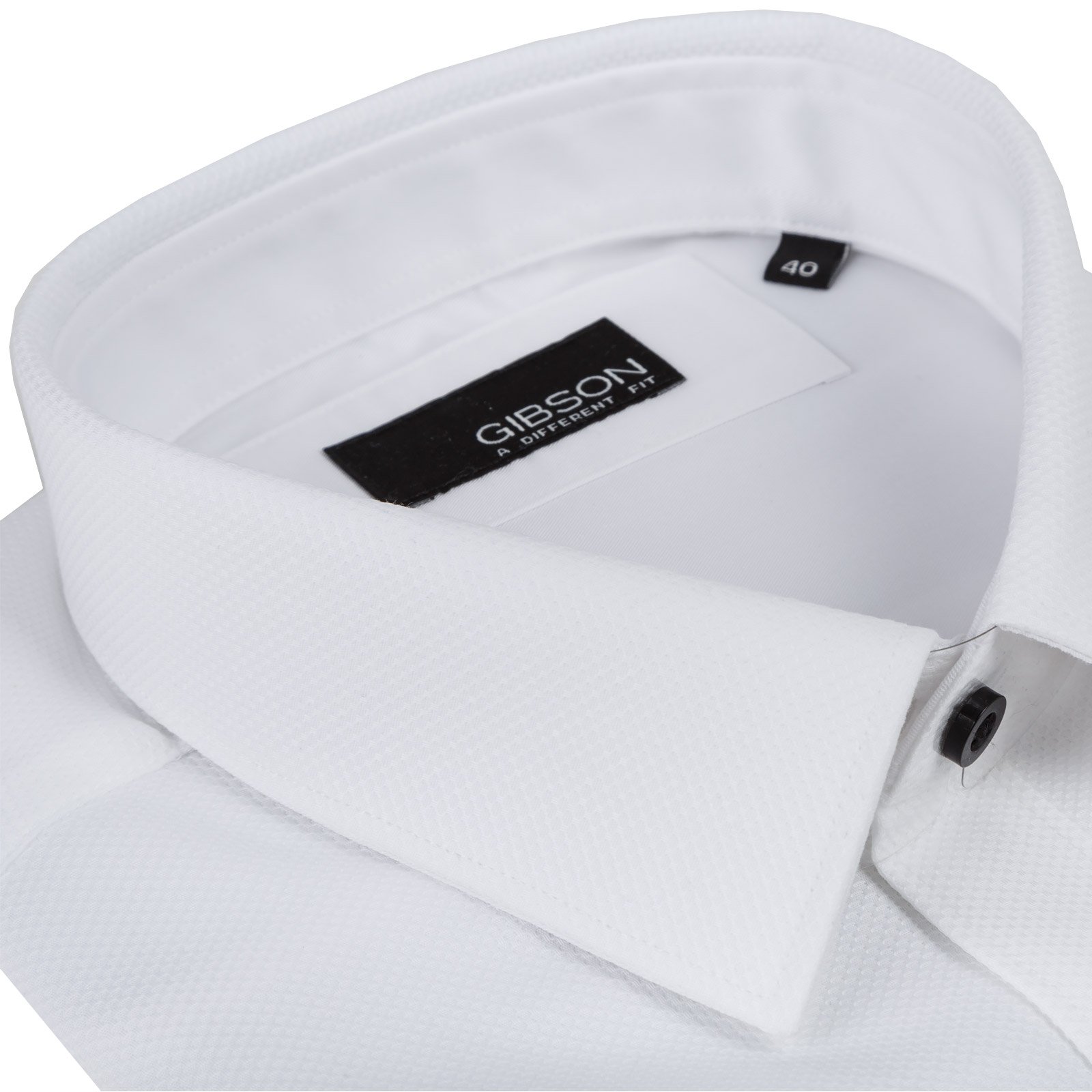 Textured weave cotton formal dress shirt with black contrasting buttons, and double cuffs. Features darts in the back for a slim fit, and a small point collar.
