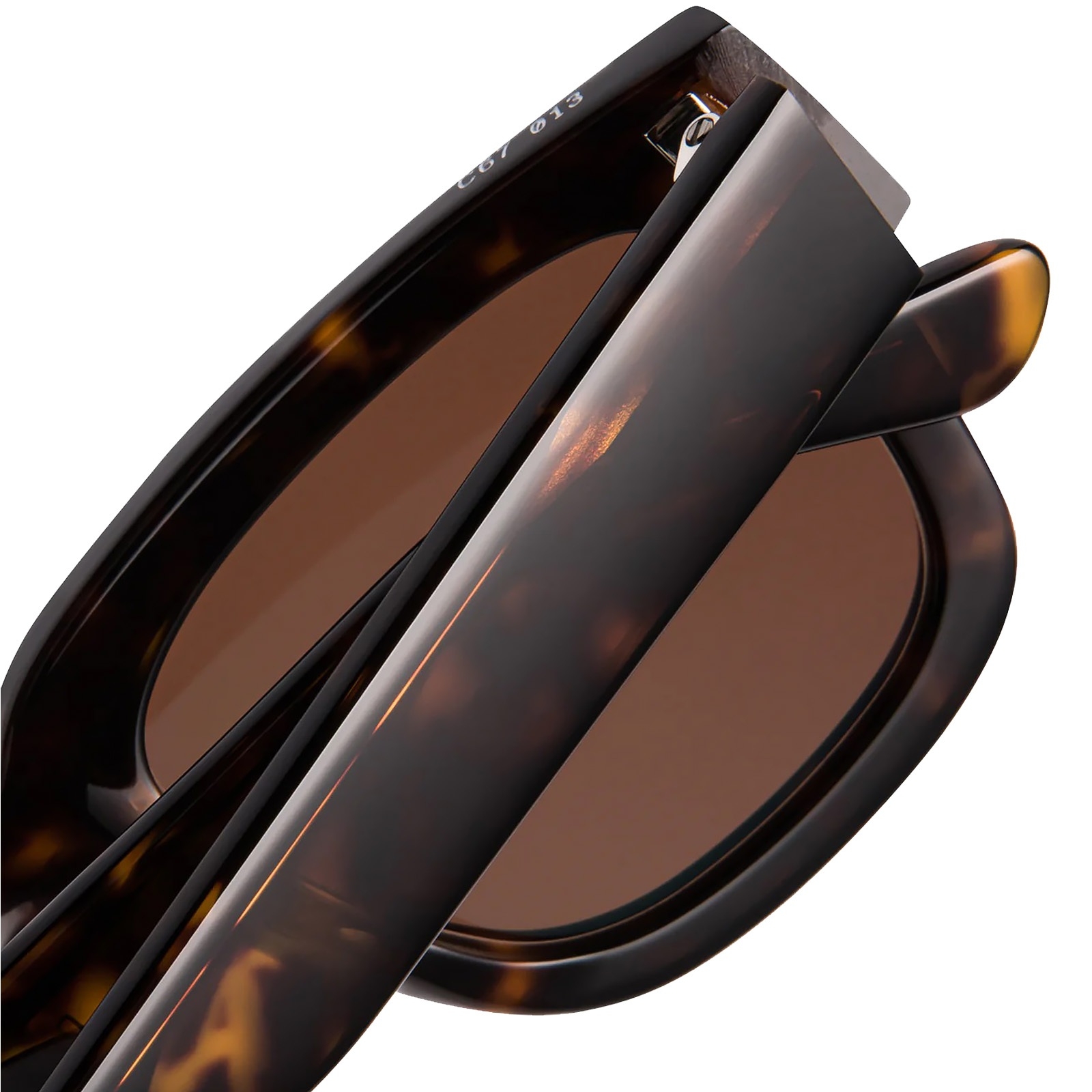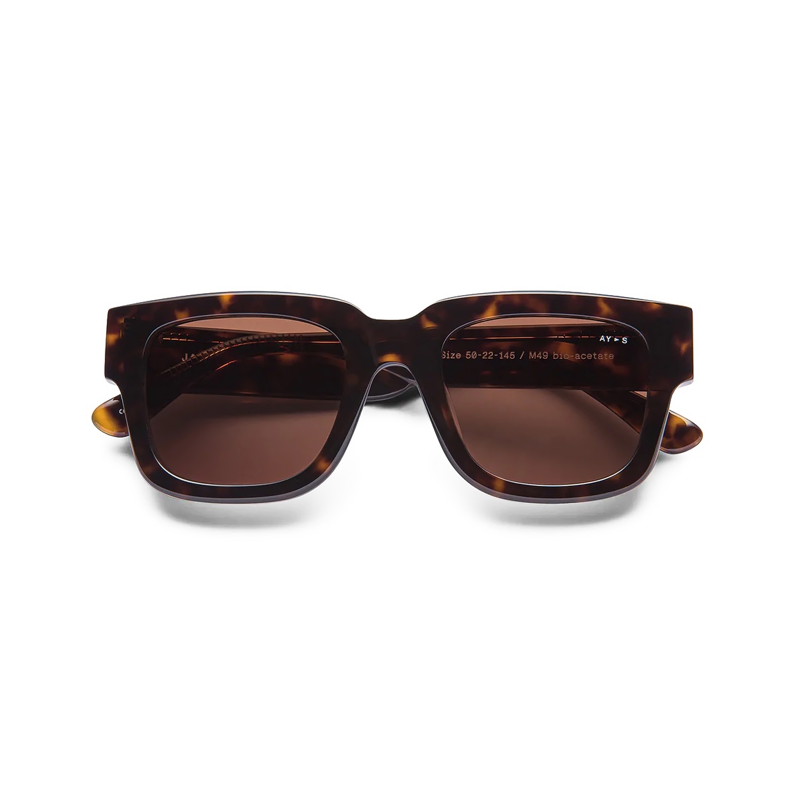 The sunglasses are made from plant-based acetate from Mazzucchelli in Italy. The hinges are from OBE with a special rubber coating, making the friction and longevity perfect. The hinges are made from up to 60% of reused metal chips from old hinges. The sun lenses are Columbia Resin 39 (CR39) with an anti-reflection coating on the inside and a special UV filter with protection up to 400 nm and an index of 1.5.