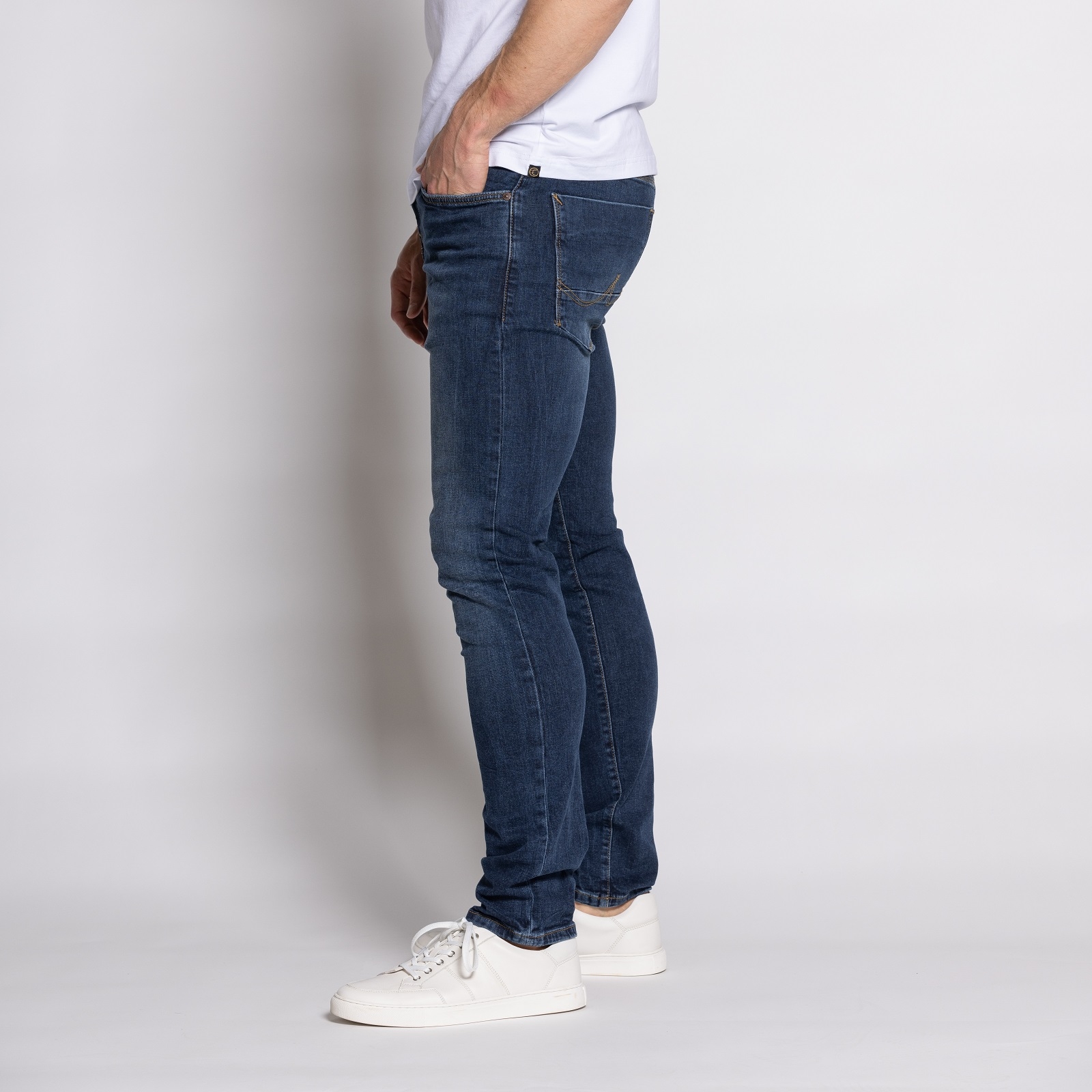 These dark aged, indigo, stretch denim jeans are a casual classic for your wardrobe. Tapered fitting in a comfortable stretch denim. Wear them with a T-shirt and sneakers for a comfortable weekend outfit.