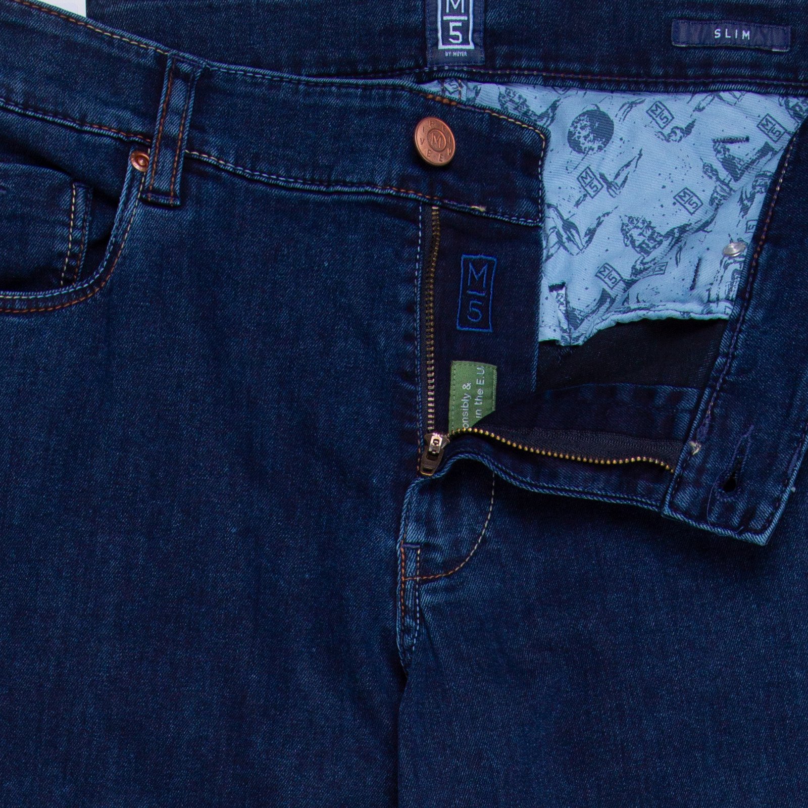 Zip fly. Multi-coloured stitching.