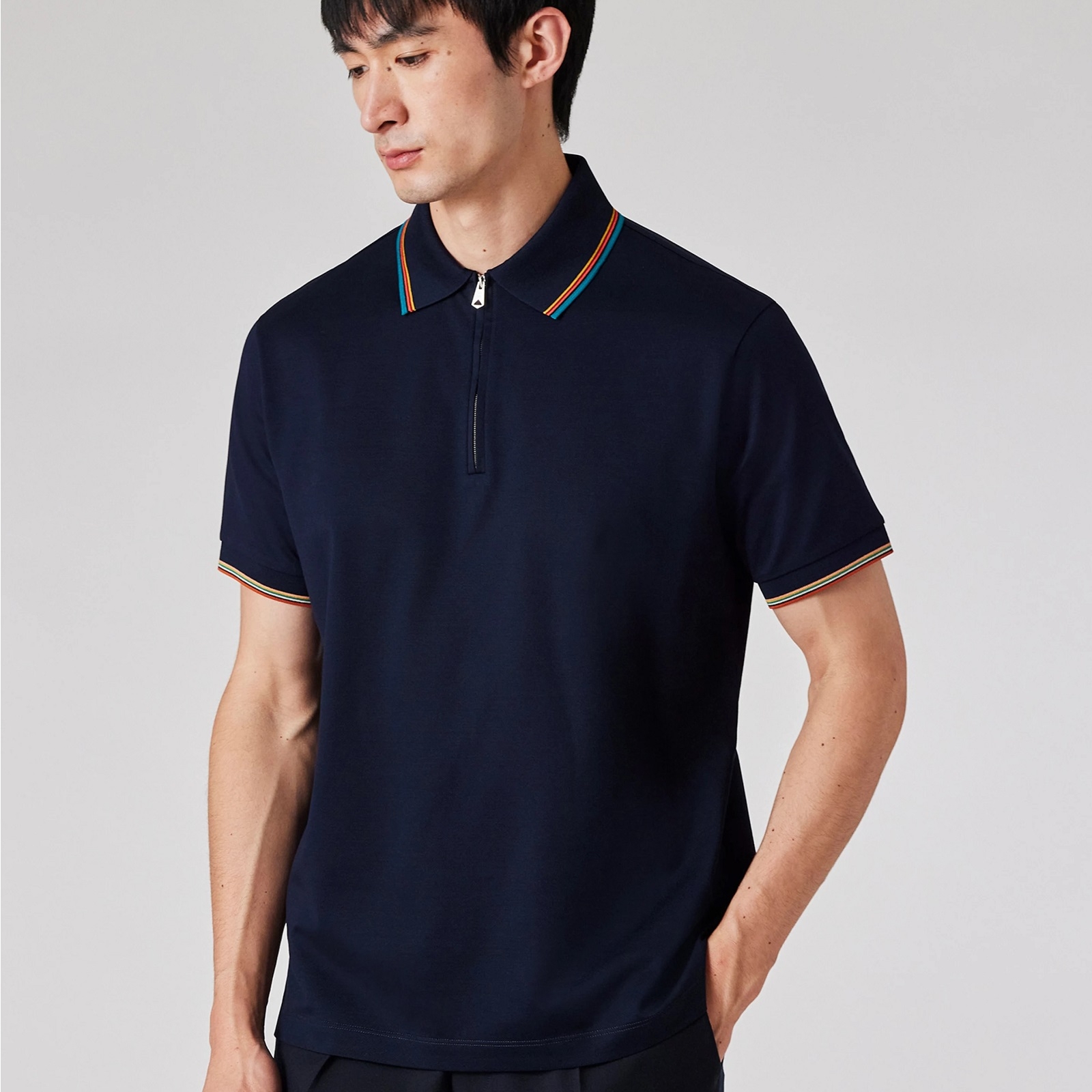 Luxury Zip Polo With Stripe Collar Trim