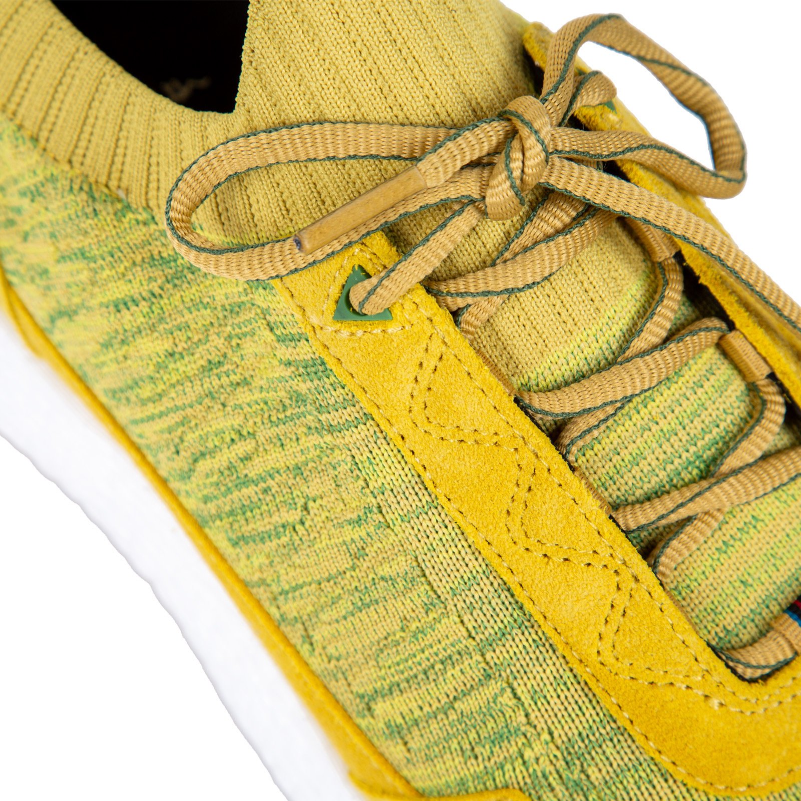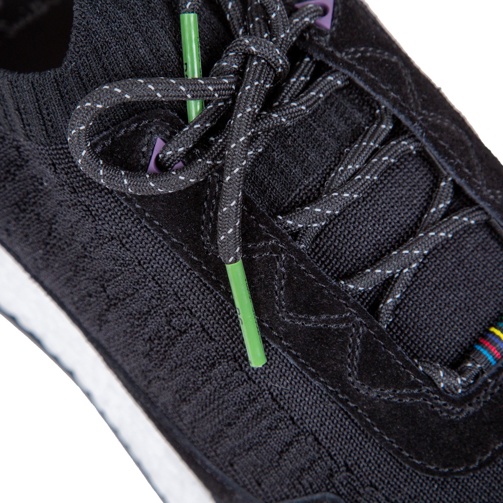 100% polyester uppers, with 100% leather trim, 100% rubber soles.