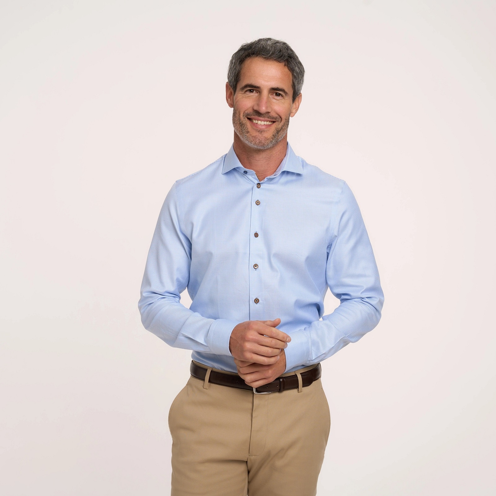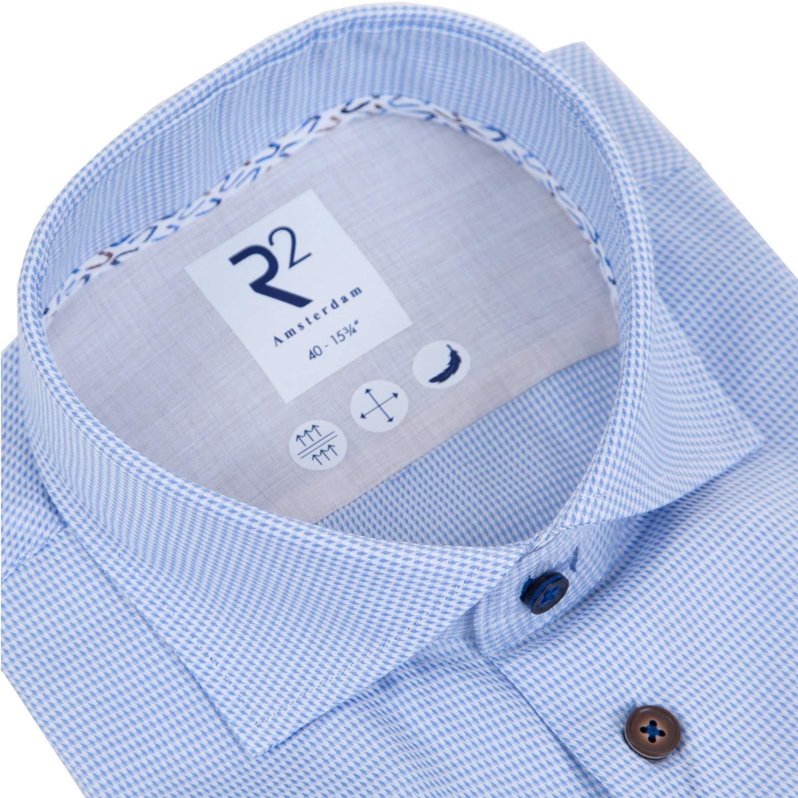 Luxury 2-ply cotton Pied-de-Poule dress shirt, woven with a micro houndstooth check pattern. 2 PLY cotton is woven with a cotton thread consisting of two strands (double twisted). The result is an extra firm, high-quality and soft material. Features darts in the back for a tapered fit. Modern spread collar. Double button cuffs with contrast buttons and geometric print trim detail in collar and cuffs.