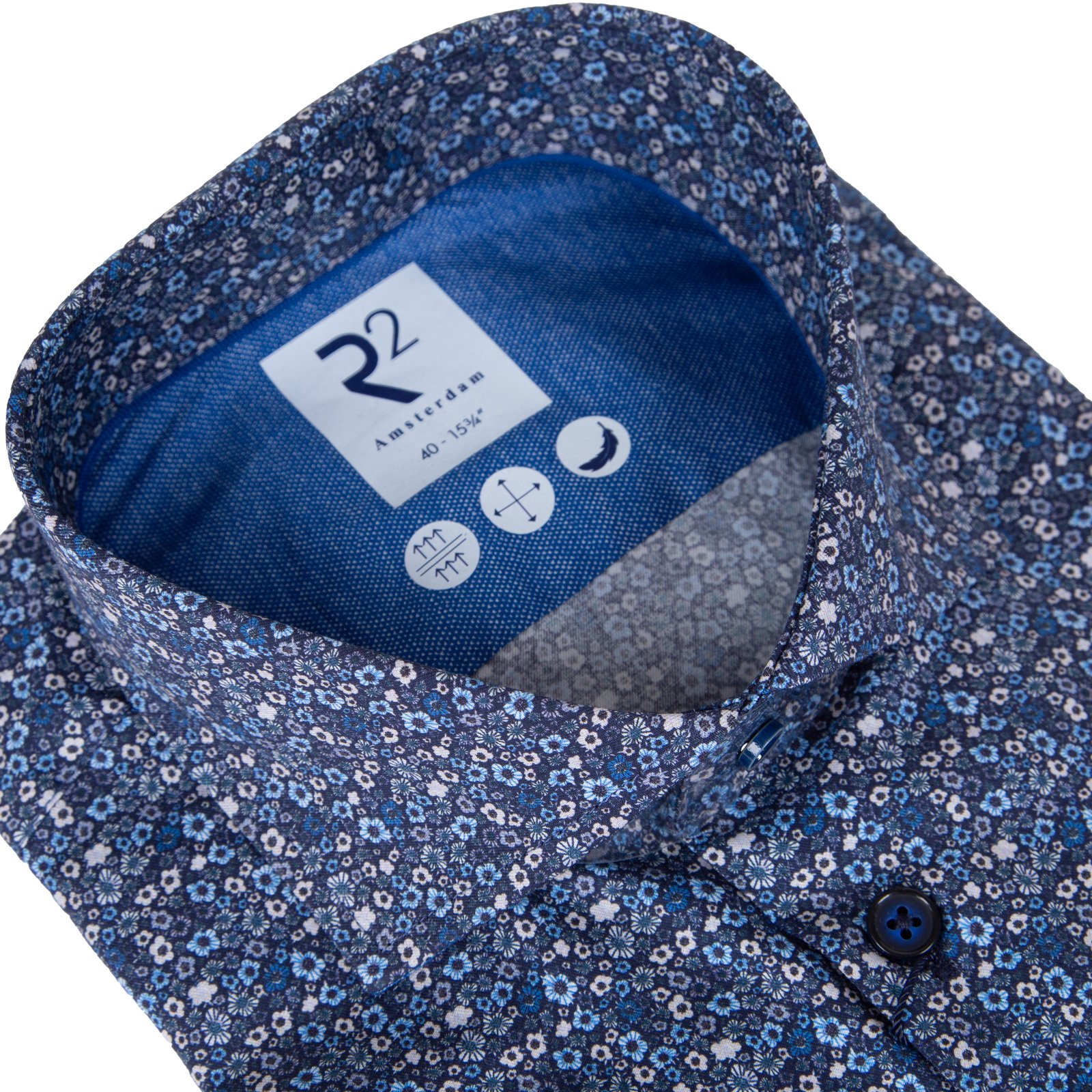 Luxury cotton dress shirt in an abstract micro floral print. Features darts in the back for a tapered fit. Modern spread collar. Double button cuffs with contrast buttons.