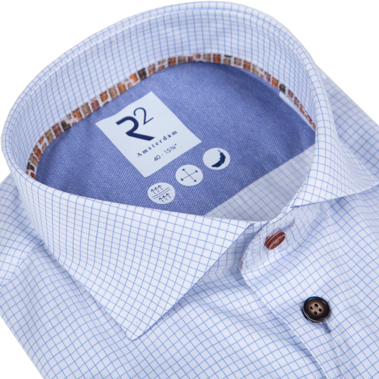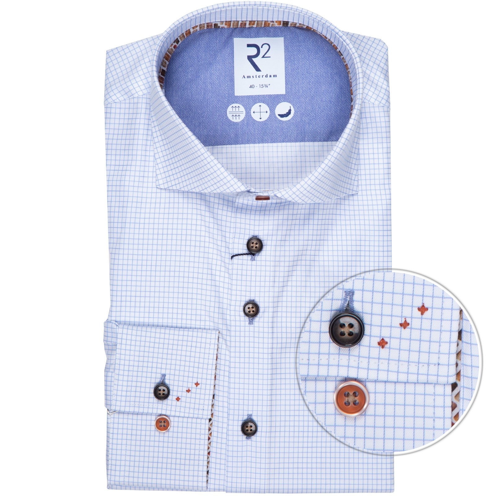 Luxury fine cotton twill dress shirt, woven with a small window-pane check pattern. Features darts in the back for a tapered fit. Modern spread collar. Double button cuffs with contrast buttons and geometric print trim detail in collar and cuffs.