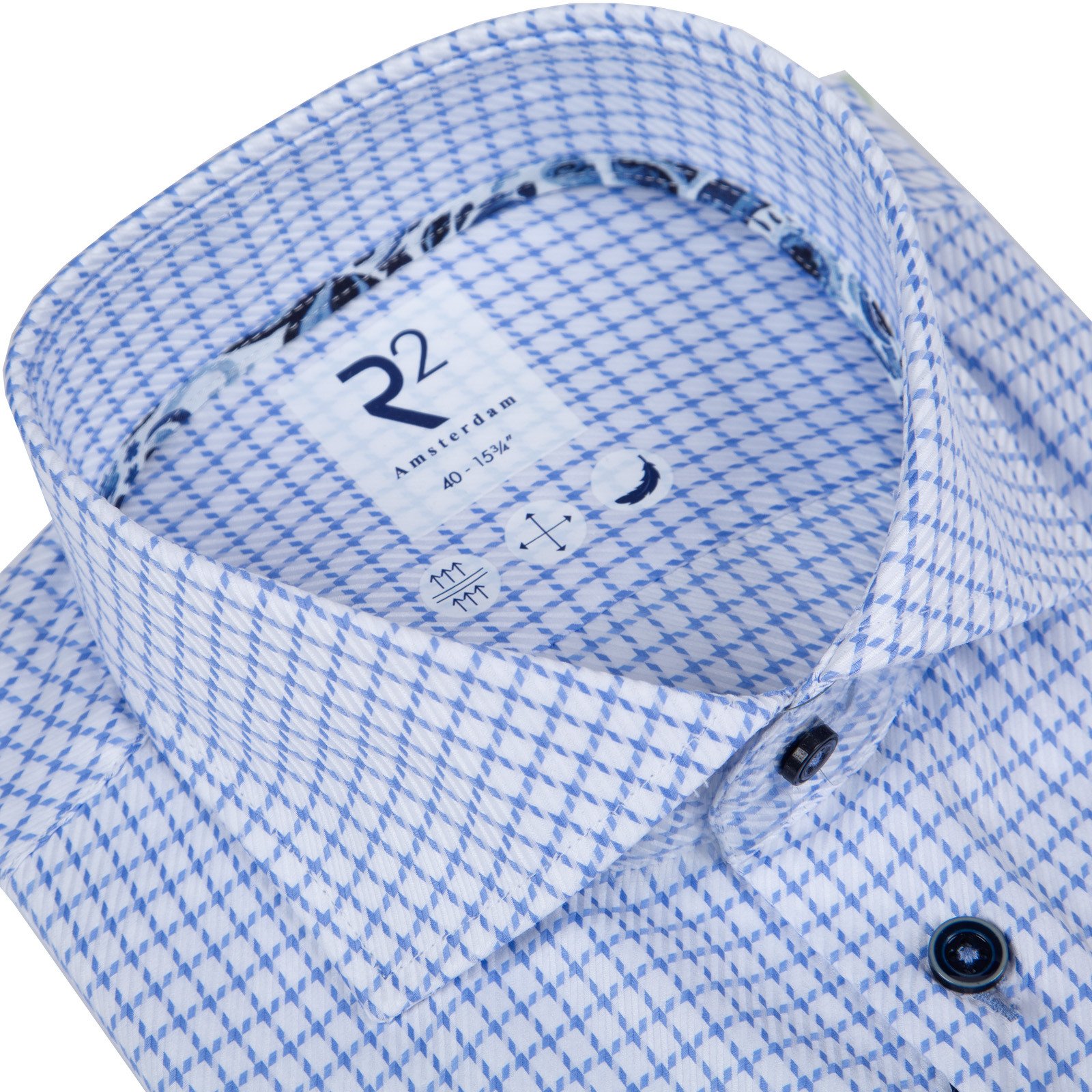 Luxury 2-ply cotton twill dress shirt, woven with a check pattern. 2 PLY cotton is woven with a cotton thread consisting of two strands (double twisted). The result is an extra firm, high-quality and soft material. Features darts in the back for a tapered fit. Modern spread collar. Double button cuffs with contrast buttons and geometric print trim detail in collar and cuffs.